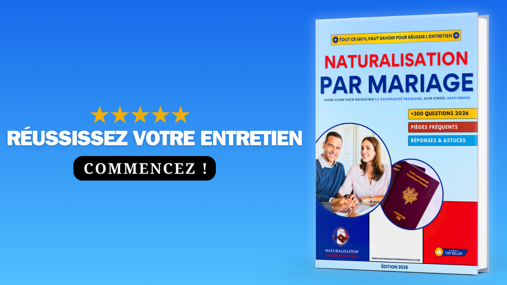 Notre guide, "Naturalisation par Mariage: +300 Questions pour Réussir votre Entretien & Éviter les Pièges", est bien plus qu’un simple livre : c’est votre allié de confiance pour réussir cet entretien et obtenir votre passeport français.